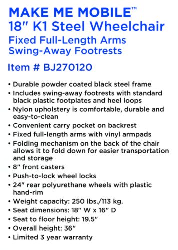 Durable powder coated black steel frame * Includes swing-away footrests with standard black plastic footplates and heel loops * Nylon black upholstery is comfortable durable and easy to clean * Convenient carry pocket on the backrest * Fixed full-length arms with vinyl armpads * Folding mechanism on the back of the chair allows it to fold down for easier transportation and storage * 8 front casters * Push-to-lock wheel locks * 24 rear polyurethane wheels with plastic hand-rim * Weight capacity: 250 Lbs * Seat dimensions: 18 Wide x 16 Deep * Seat to floor height: 19.5 * Overall height: 36 * Limited 3 year warranty * Compatible with Drive Medical’s Silver Sport 1 model SSP118FA-SF Wheelchair *